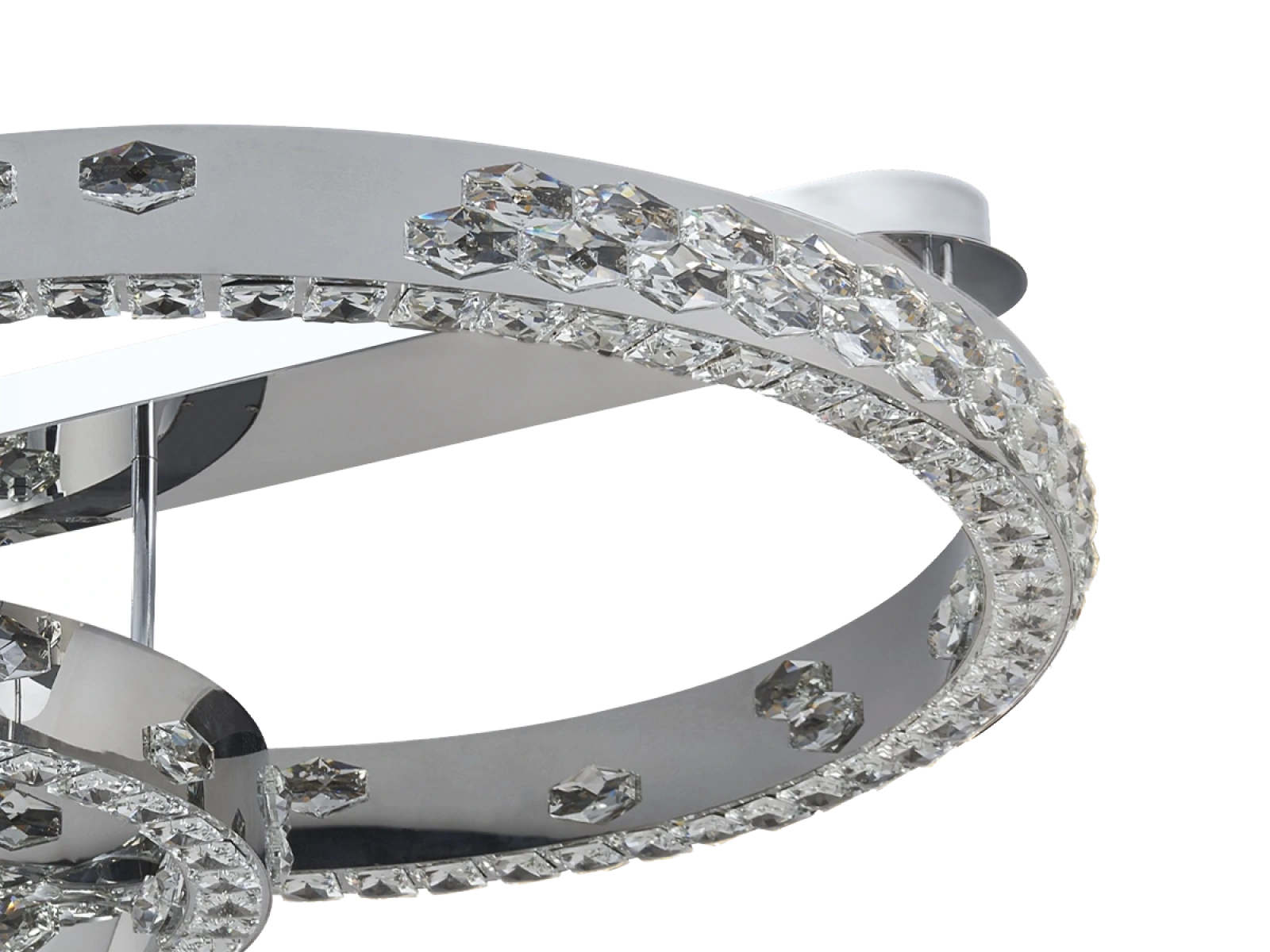 Svietidlo je vyrobené z vysokokvalitného nerezového kovu s chrómovou povrchovou úpravou, doplnené o precízne brúsené kryštály, ktoré umocňujú odraz a lom svetla. Použitá technológia spracovania zabezpečuje dlhodobú stabilitu materiálu a zachovanie jeho estetického vzhľadu.