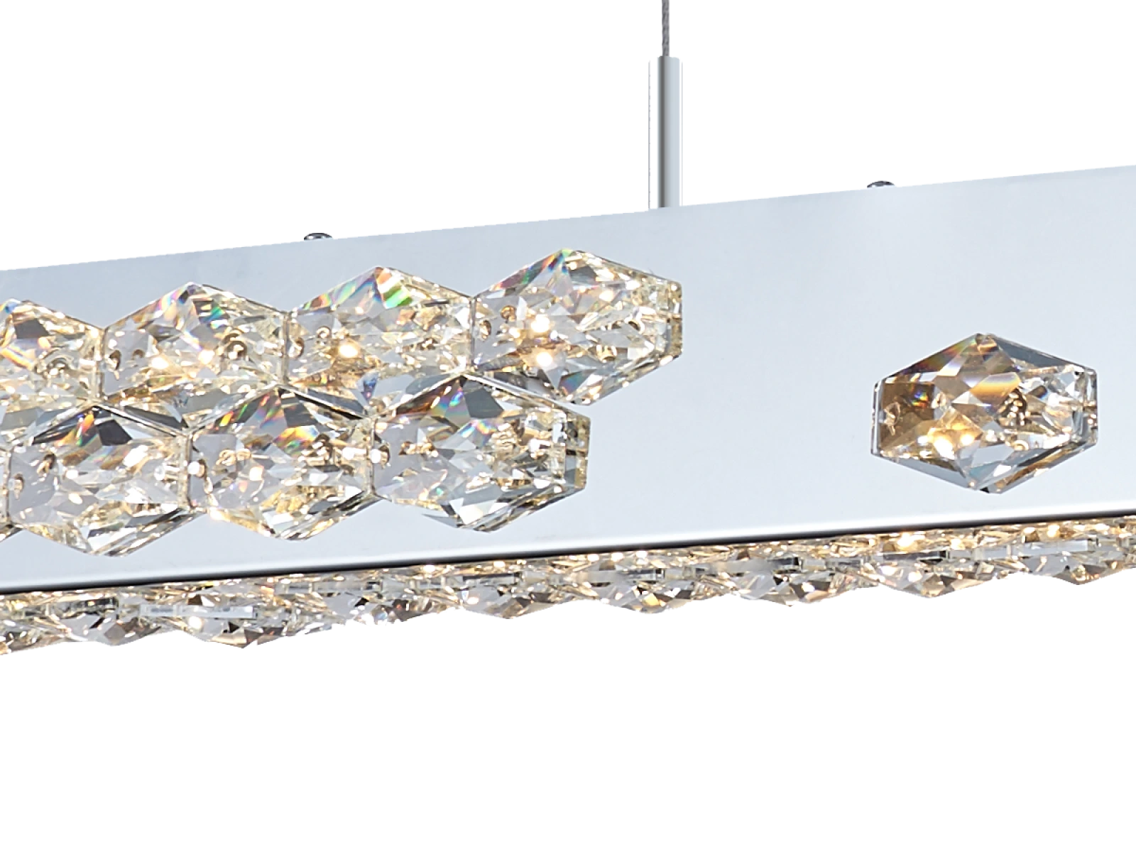 Svietidlo je vyrobené z vysokokvalitného nerezového kovu s chrómovou povrchovou úpravou, doplnené o precízne brúsené kryštály, ktoré umocňujú odraz a lom svetla. Použitá technológia spracovania zabezpečuje dlhodobú stabilitu materiálu a zachovanie jeho estetického vzhľadu.