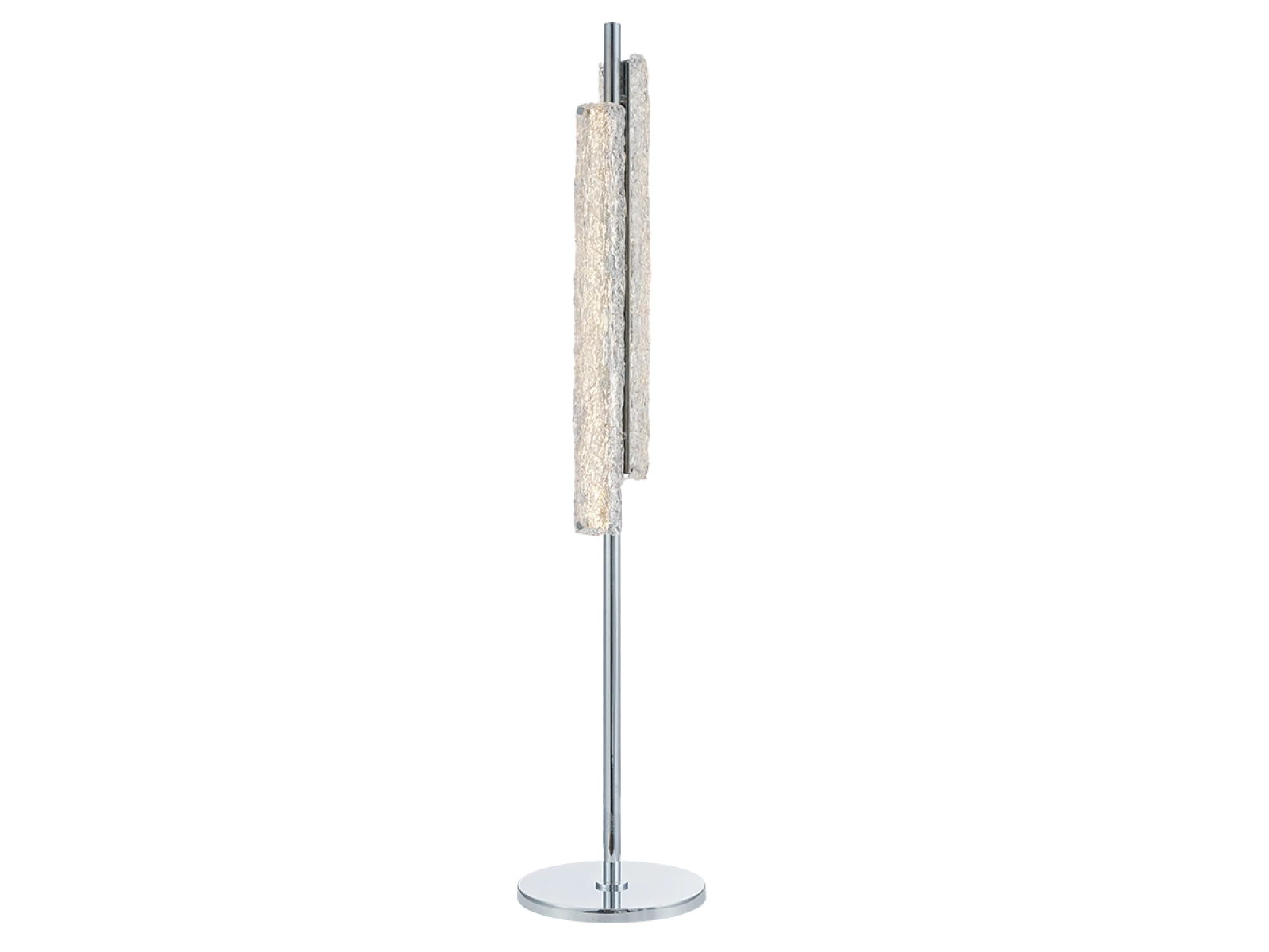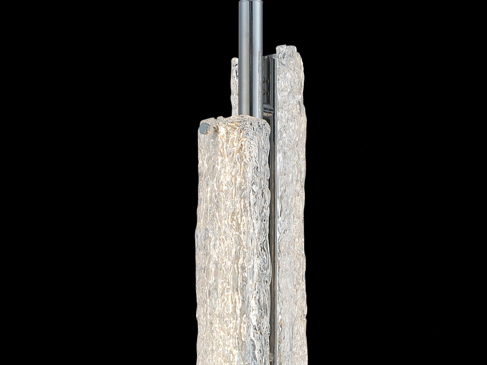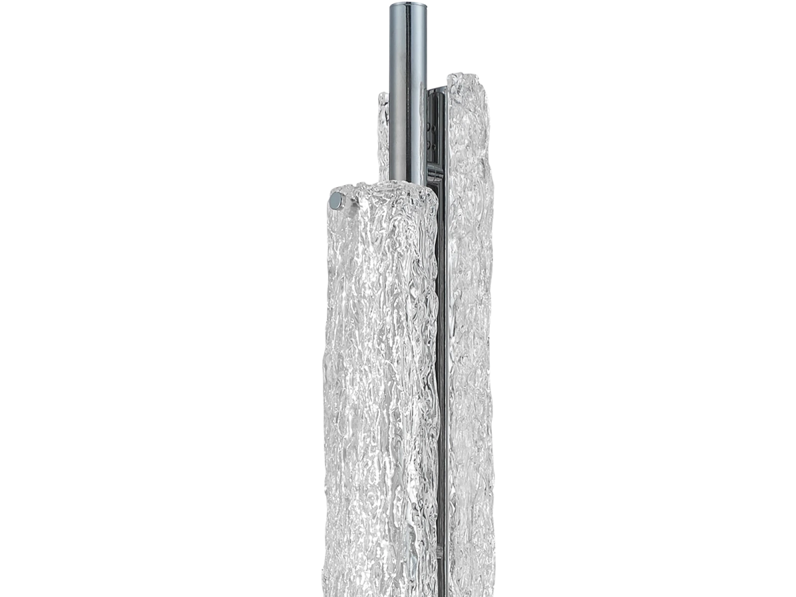 The luminaire is made of high quality stainless steel metal with a chrome finish that ensures long lasting durability, stability and a luxurious appearance. The glass elements with a textured bark-inspired surface ensure an even and pleasant light diffusion.